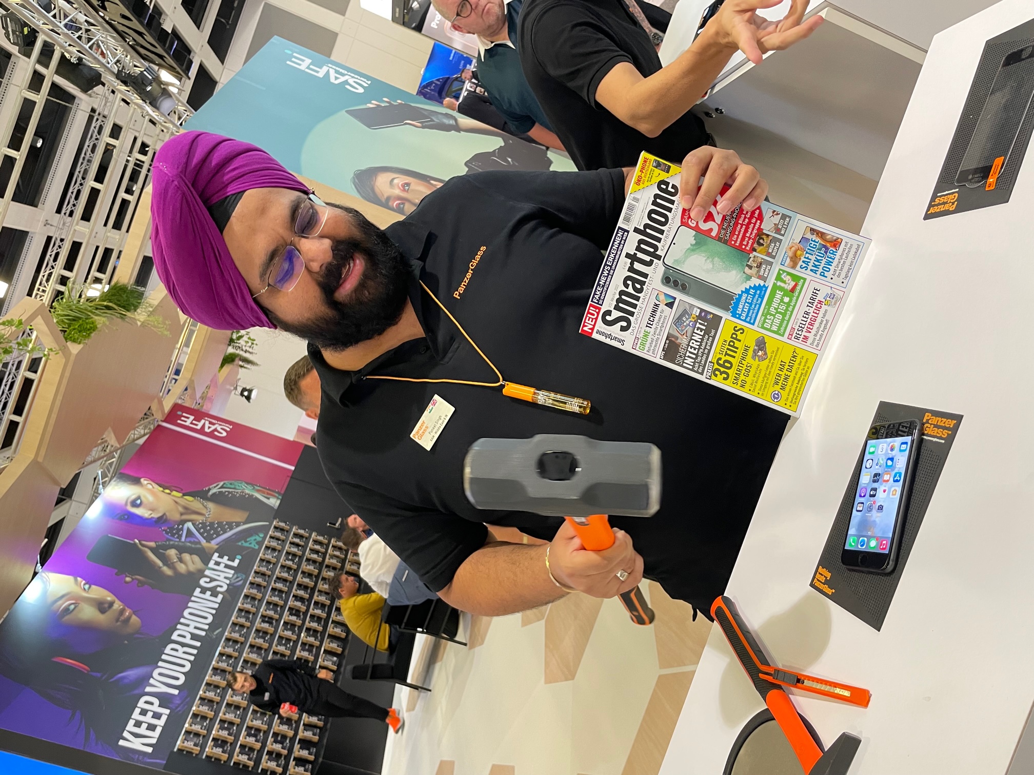 PanzerGlass Am Stand des Zubehör-Gurus wurde uns veranschaulicht, dass selbst Hammerschläge den Panzergläsern nichts anhaben können.