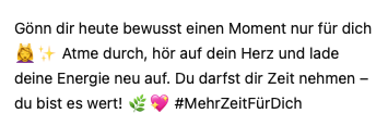 Prompt: Du bist Social-Media-Managerin. Verfasse einen kurzen, motivierenden Instagram-Post zum Thema “Mehr Zeit für dich” – im freundlichen, positiven Ton. Max. 400 Zeichen, mit Emoji und Hashtag.