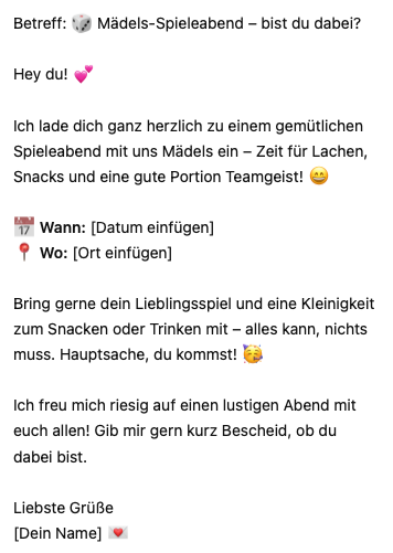 Prompt: Schreibe eine freundliche E-Mail-Einladung für einen Spieleabend mit Freundinnen. Lockerer Ton, Datum und Ort sollen eingefügt werden. Betone, dass jeder etwas mitbringen kann.