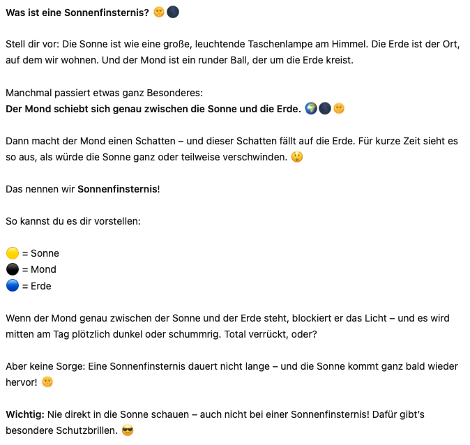 Prompt: Erkläre Grundschulkindern in einfachen Worten, wie eine Sonnenfinsternis entsteht. Verwende einen freundlichen Ton und anschauliche Bilder.