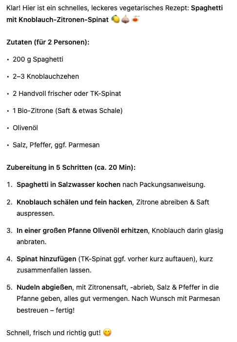 Prompt: Schlage mir ein schnelles, vegetarisches Abendessen vor – max. 20 Minuten Zubereitungszeit, mit Zutaten, die man meist zuhause hat. Gib mir das Rezept in 5 klaren Schritten.