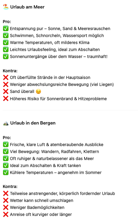 Prompt: Ich kann mich nicht entscheiden, ob ich im Urlaub lieber ans Meer oder in die Berge fahren soll. Gib mir eine übersichtliche Pro- und Kontra-Liste für beide Optionen.