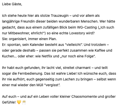 Prompt: Du bist Trauzeugin. Schreibe eine persönliche, humorvolle Hochzeitsrede mit Anekdoten über das Paar, ohne kitschig zu sein. Max. 1 Minute.