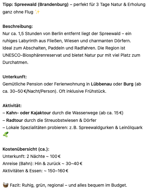 Prompt: Empfiehl mir ein Reiseziel für 3 Tage, max. 300 €, ab Berlin. Ich mag Natur, kleine Orte, kein Flug. Gib mir eine kurze