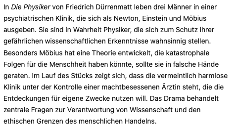 Prompt: Fasse „Die Physiker“ von Friedrich Dürrenmatt in max. 5 Sätzen zusammen. Neutraler, sachlicher Stil.