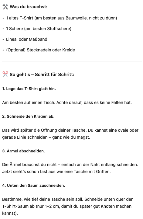 Prompt: Gib mir eine einfache Schritt-für-Schritt-Anleitung, wie ich aus einem alten T-Shirt eine Einkaufstasche machen kann. Ton: praktisch, motivierend.