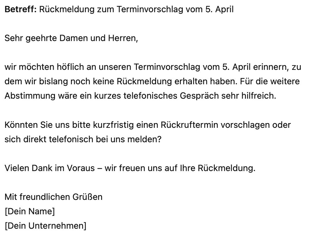 Prompt: „Du bist Assistenz in einem Beratungsunternehmen. Formuliere eine freundliche, aber bestimmte E-Mail an Partnerfirma XY, da wir noch keine Rückmeldung zum Terminvorschlag vom 5. April erhalten haben. Ziel: Rückruf einfordern. Max. 120 Wörter. Ton: professionell, lösungsorientiert.“