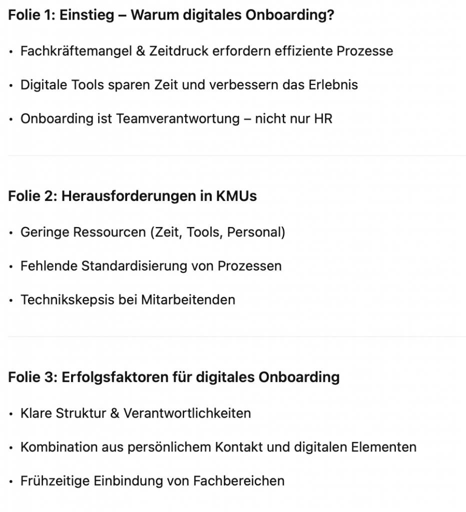 Prompt: „Erstelle eine Gliederung für eine 5-minütige Präsentation zum Thema Digitales Onboarding in KMUs. Zielgruppe: Teamleitung. Format: 5 Folien, jeweils max. 3 Bullet Points.“
