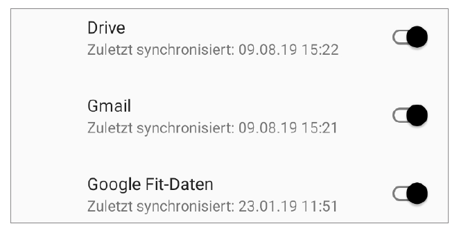 Fertigen Sie regelmäßig ein Backup der Daten an. Wichtig ist, dass Sie im Falle des Verlustes oder der Beschädigung Ihre Daten gesichert haben. Das Backup können Sie in den Einstellungen unter „Konten“ durchführen. Tippen Sie auf Ihr Google-Konto und wählen Sie unter „Kontosynchronisierung“ aus, was alles gesichert werden soll.