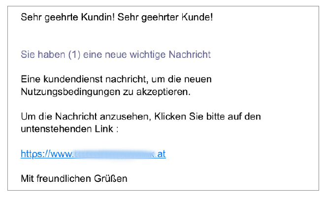 Seien Sie vorsichtig im Umgang mit Fake-E-Mails. Unter dem Deckmantel einer vertrauten Institution wie etwa einer Bank oder einer Versicherung, verstecken die Absender solcher Mails gerne Links, die Sie auf dubiose Webseiten leiten, wo allerhand Gefahren lauern. Solche Mails lassen sich oftmals durch schlechte Rechtschreibung erkennen.