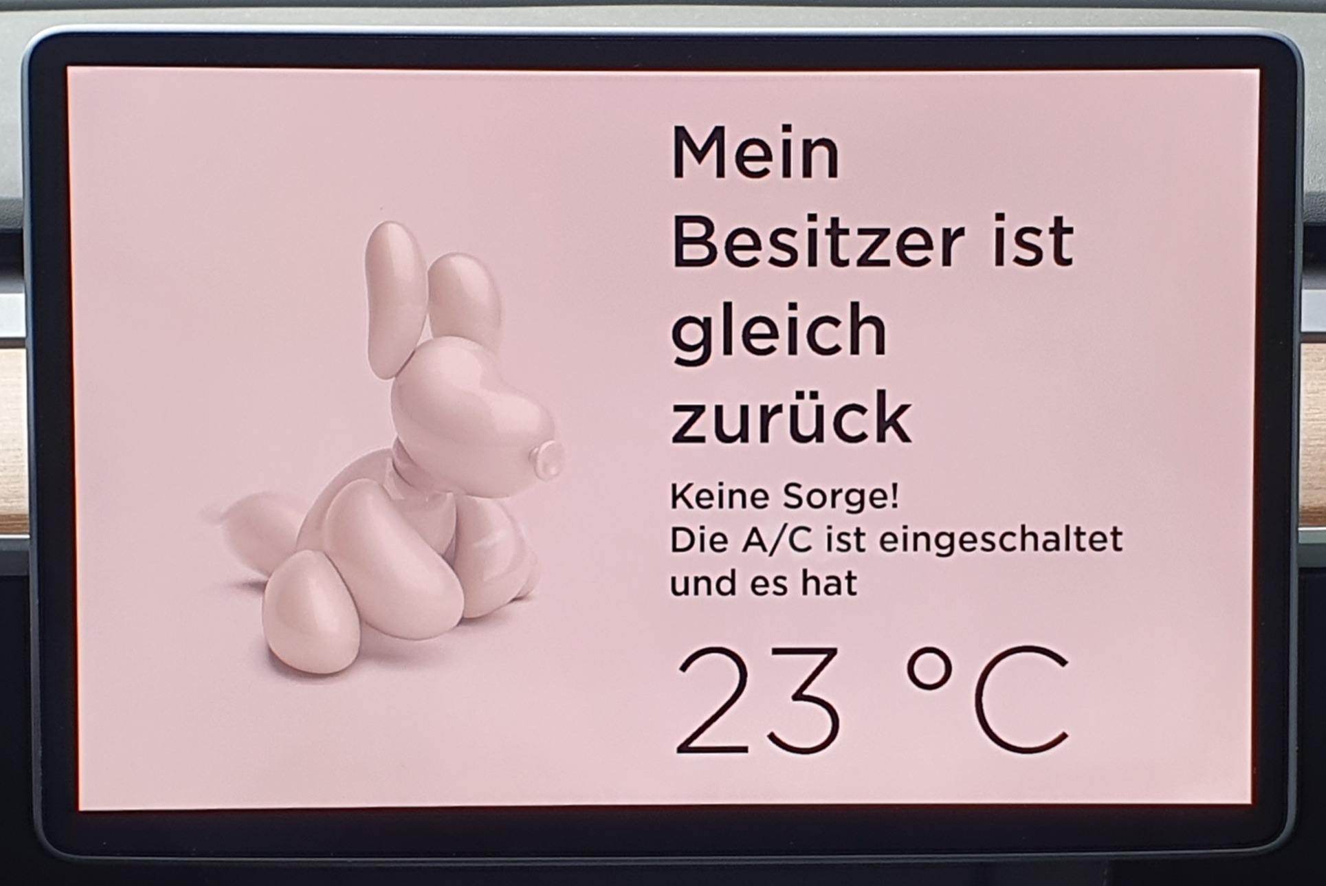 Zum Abschluss eine sehr charmante Funktion des Tesla-Infotainmentsystems. Bei der Klimaanlagensteuerung können Sie rechts auf den Menüpunkt „Hund“ tippen, dann bleibt die Klimaanlage auch eingeschaltet, wenn Sie sich vom Wagen wegbewegen und ein im Wagen verbleibender Vierbeiner bekommt keine Probleme mit eventueller Stauungshitze. Dem nicht genug, steht die rechts abgebildete Meldung gut lesbar im Display, die auch von außen sichtbar ist.