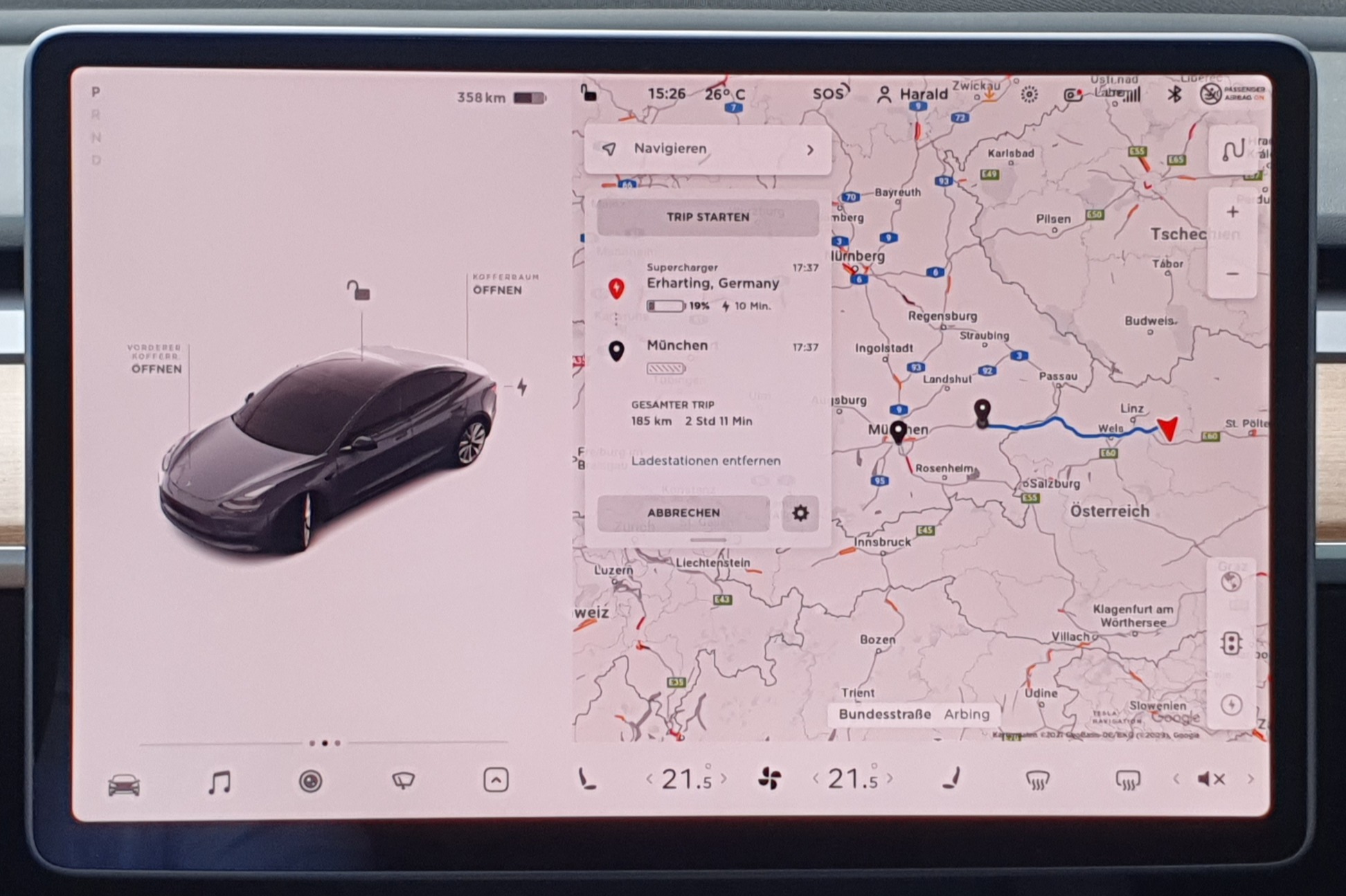 Das Navigationssystem des Wagens lässt sich wie ein herkömmliches Navi bedienen. Sie können das gewünschte Ziel eingeben, aus mehreren Routen wählen und auch aussuchen, ob Sie Maut-, sprich Autobahnstraßen meiden wollen. Allerdings wartet es auch mit einer Besonderheit auf. Der Tesla schätzt nämlich nicht nur ab, wie viel Akkuladung bis zum Ziel benötigt wird, sondern plant auch einen Zwischenhalt ein, falls der vorhandene Strom nicht ausreichend sein soll. Dazu kennt er alle vorhandenen Supercharger und sucht den aus, der am passendsten an der Route liegt. Zudem informiert er sogar darüber, wie lange die Ladedauer sein wird.