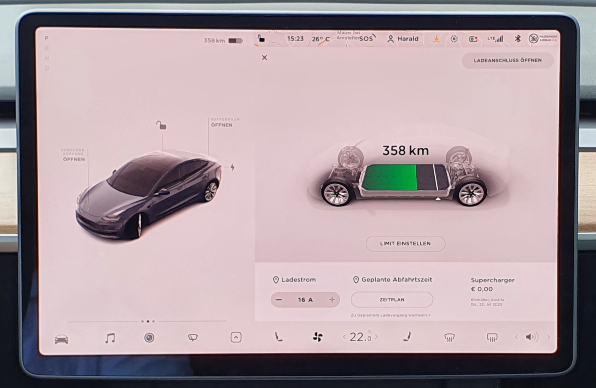 Im Einstellungsmenü für den Akku können Sie nicht nur sehen, wie viele (kumulierte) Kilometer Sie noch mit der vorhandenen Menge an Strom zurücklegen können. Dort lässt sich auch ein genaues Limit festlegen, bis zu welcher Marke die Batterie beim nächsten Ladevorgang gefüllt werden soll. Bekanntermaßen soll der Stromspeicher nämlich nicht jedes Mal auf 100 Prozent druckbetankt werden, dann sollten die Haltbarkeit und Langlebigkeit merklich besser sein. Haben Sie ein Supercharger-Guthaben, wird es auch in dieser Anzeige abgebildet. Außerdem können Sie einen genauen Zeitplan festlegen, damit der Wagen exakt zur nächsten Abfahrtszeit vollgeladen ist.