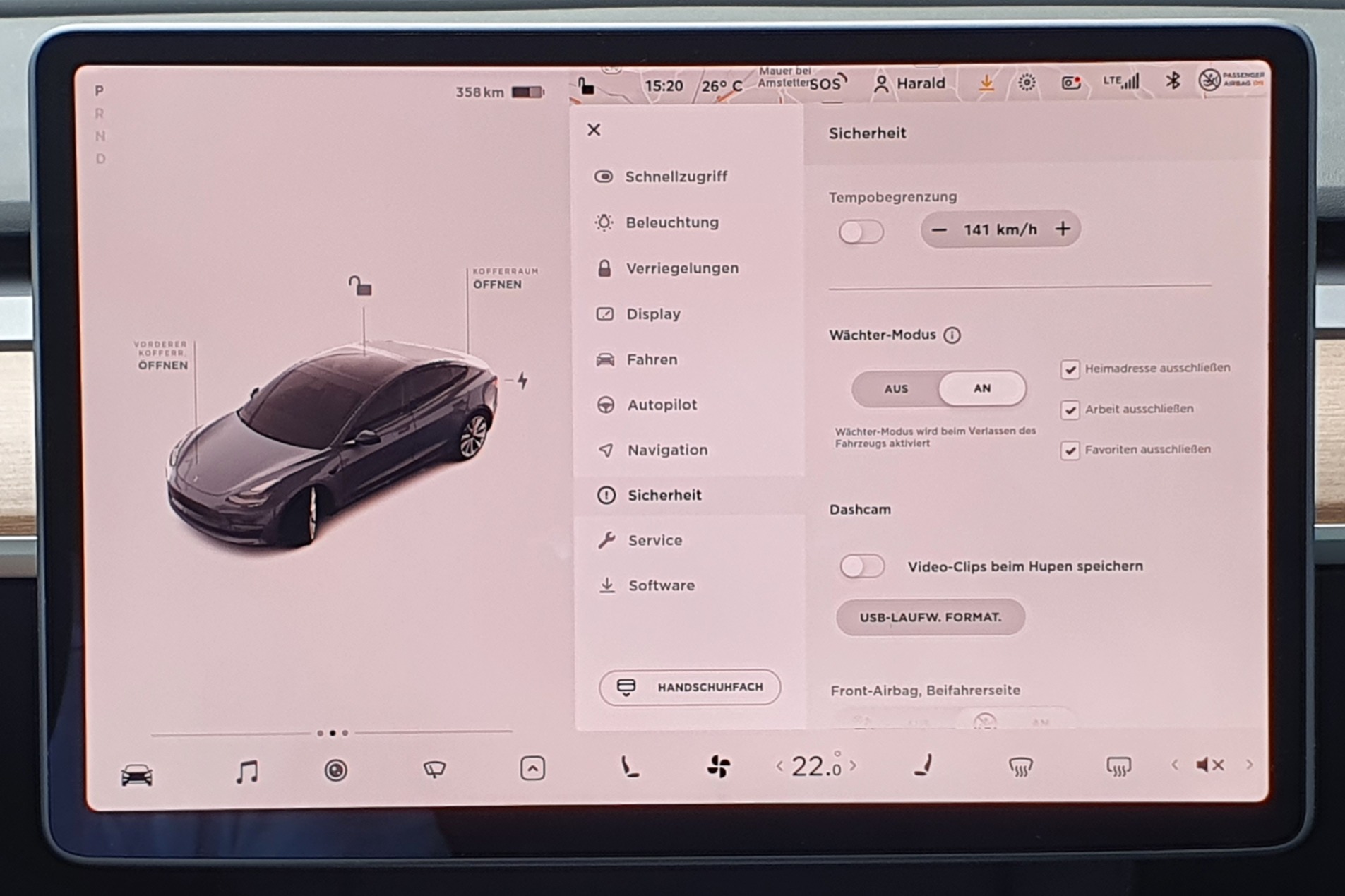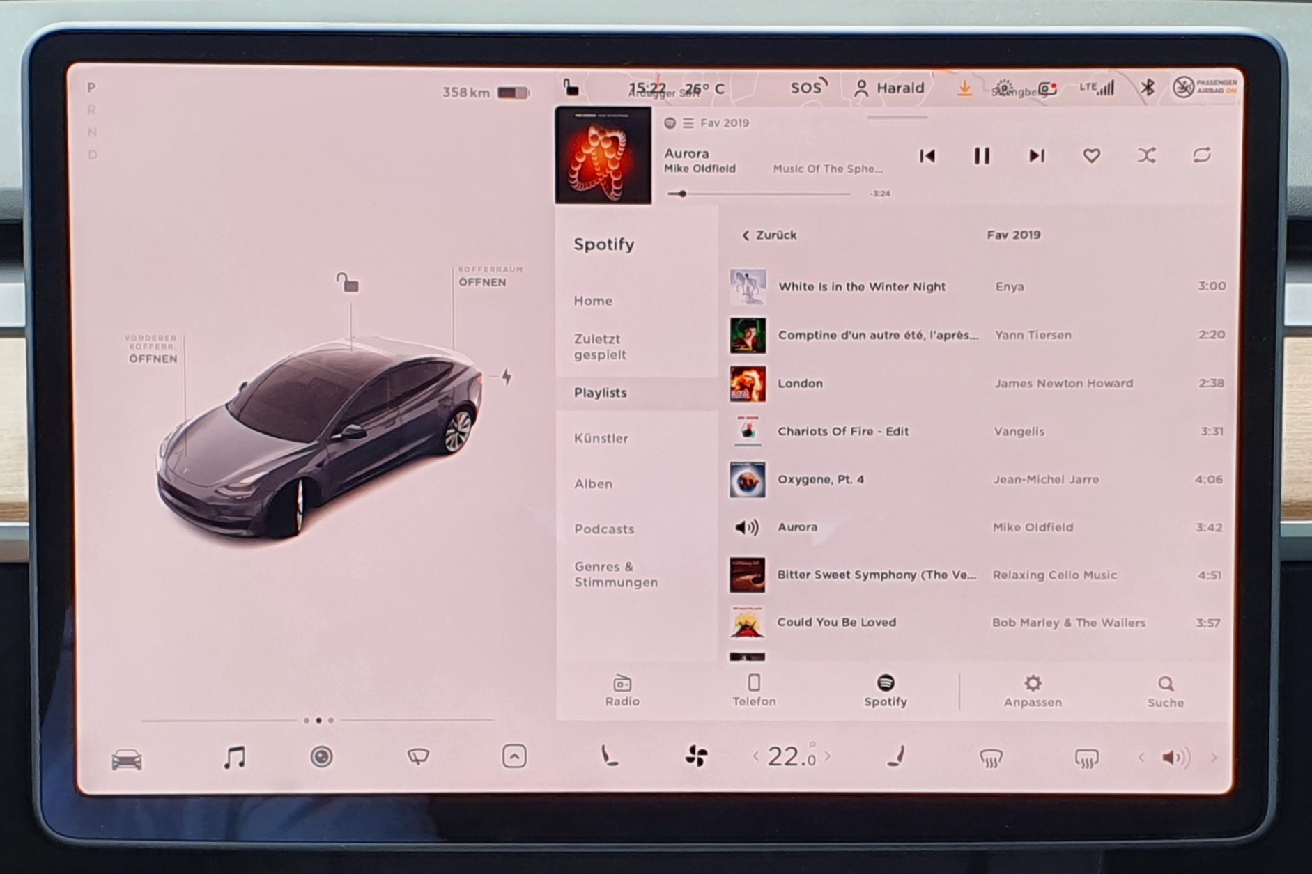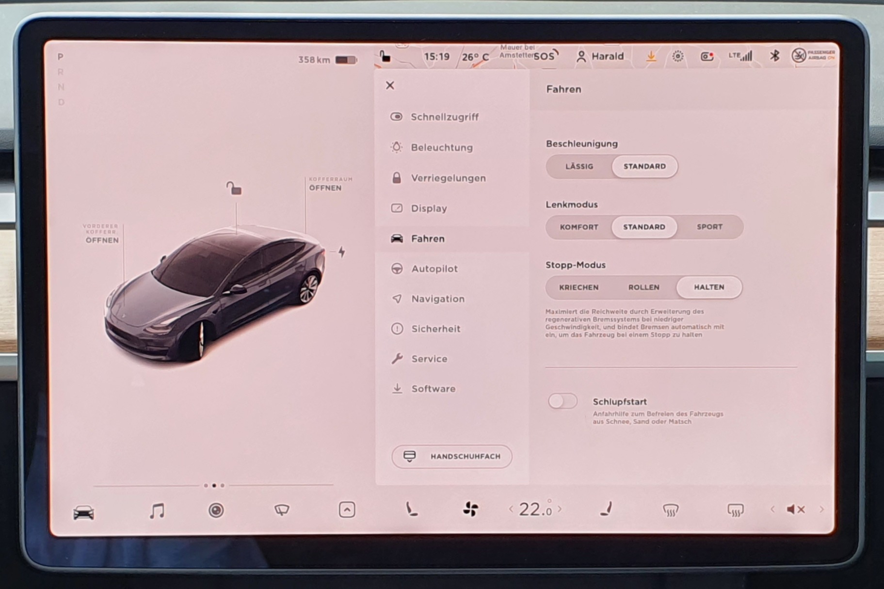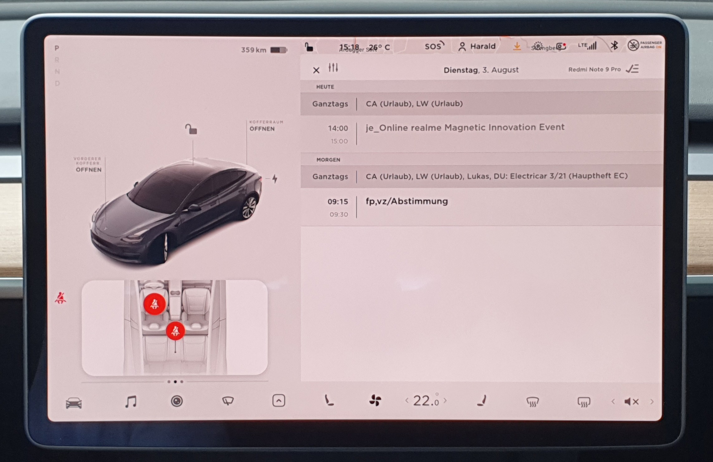 Betritt der Fahrer den Wagen, so begrüßt das Infotainmentsystem mit dem hier abgebildeten Startscreen. In der Zeile am oberen Bildschirmrand sind neben der Uhrzeit und der Außentemperatur auch das Profil, die Empfangsqualität der im Wagen integrierten SIM-Karte sowie eine aktive Bluetooth-Verbindung angezeigt. Außerdem sehen Sie in der rechten Ecke den Namen des mit dem Tesla verbundenen Smartphones, in unserem Fall ein Redmi Note 9 Pro. Groß angezeigt werden außerdem die Termine des Tages, da der Bordcomputer auch Zugriff auf den Kalender hat. Zur Linken sehen Sie außerdem das Fahrzeug abgebildet, können bei Bedarf beide Kofferräume öffnen und auch die Zentralverriegelung bedienen. Falls Sie sich über die zwei roten Symbole links unten wundern: Der Tesla erkannte mich und meinen Kollegen beim Bedienen bzw. Fotografieren des Bordcomputers und monierte, wir seien nicht angeschnallt. Im Stand war das allerdings nicht nötig. An der Unterseite lassen sich zahlreiche Kategorien wie Musik, Kameras, Scheibenwischer, die Lüftung oder Heck- und Frontscheibenheizung aufrufen.