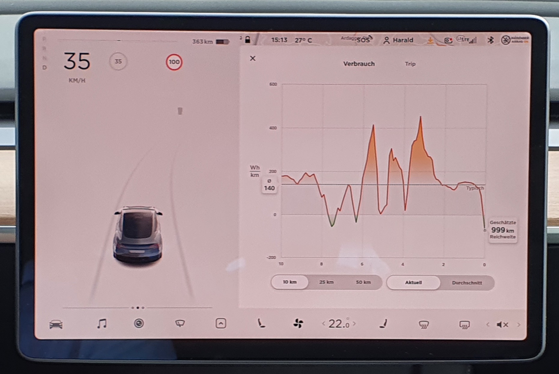 Auf der Unterseite des Startbildschirmes finden Sie einen nach oben zeigenden Pfeil, mit welchem Sie ein Untermenü öffnen können. Darin finden Sie den Punkt Energie, der interessante Statistiken zu Tage fördert. Der Wagen zeigt nämlich detailliert an, wie Sie mit Ihrer Fahrweise auf den zuletzt zurückgelegten Kilometern dazu beigetragen haben, wie viel Restreichweite der Energiespender noch bietet und wann bzw. wie häufig dieser Energie gezogen und im Optimalfall durch Rekuperation sogar zurückbekommen hat. Sie können den Verbrauch entweder der letzten zehn, 25 oder 50 Kilometer anzeigen lassen, sowohl im Durchschnitt, als auch als Momentverbrauch.