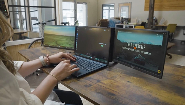 Tri-Screen 3 fügt Ihrem Notebook zwei Bildschirme hinzu. Das Aufbauen soll lediglich 10 Sekunden in Anspruch nehmen. Die Bildschirme haben eine Diagonale von jeweils 13,3 Zoll und eine Auflösung von 1.920 mal 1.080 Punkten.