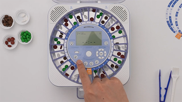 Diese Pillendose erinnert Sie an das Einnehmen Ihrer Medikamente – durch Lichtsignale und durch gesprochene Hinweise. Darüber hinaus platziert die Dose das jeweils benötigte Medikament in ihrem Ausgabefach.