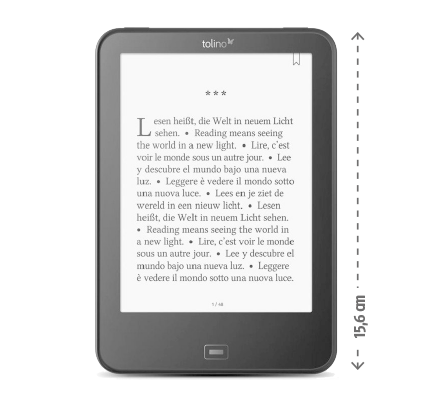 Preis: EUR 119,00 // Display: 6 Zoll, 300 ppi // Speicher: 8 GB // Synchronisation: WLAN // Gewicht: 166 Gramm, Maße: 110,2 x 156,4 x 8,35 mm // bit.ly/tolino_sm
