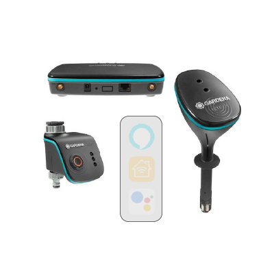 Dieses Set von Gardena umfasst einen Bewässerungscomputer, einen Sensor und eine zentrale Verbindungsstelle, auch Gateway genannt. Der Computer lässt sich mithilfe der kostenlosen App oder per Hand bedienen und versorgt den Rasensprenger auf Wunsch mit Wasser. Der kabellose Sensor misst die Bodenfeuchtigkeit und aktiviert bei Bedarf selbstständig den Sprenger.