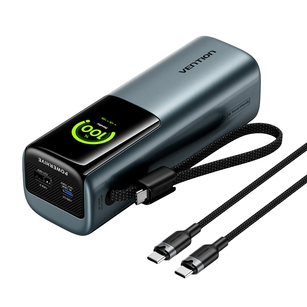 Die Vention Power Bank bringt satte 27.000 mAh in kompakter Bauweise und liefert bis zu 200 Watt Leistung – genug, um sogar zwei Laptops gleichzeitig zu versorgen. Dank PD3.1, PPS und UFCS lädt sie High-End-Geräte im Eiltempo, während das smarte TFT-Display Ladestand, Temperatur und Leistung in Echtzeit anzeigt. Das integrierte USB-C-Kabel dient zugleich als Trageschlaufe.