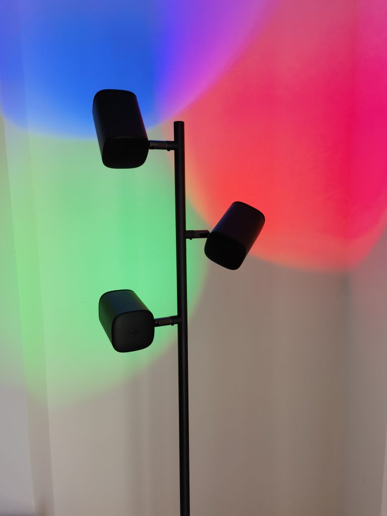 Drei unabhängig verstellbare Arme erlauben eine 350-Grad-Drehung der Lampen horizontal und 90 Grad vertikal – ideal, um gezielt Wände, Pflanzen oder den Lesebereich zu beleuchten. Mit einer Helligkeit von bis zu 1500 Lumen (500 Lumen pro Arm) und stufenlos einstellbarer Farbtemperatur von 2700 bis 6500 Kelvin eignet sie sich als sowohl als Leselicht wie auch als stimmungsvolle Ambientebeleuchtung. Das LuminBlend-System ermöglicht laut Hersteller 16 Millionen Farben und 64 vordefinierte Szenen sowie DIY-Optionen und per integriertem Mikrofon und der Musik-Sync-Funktion liefert die Stehlampe eine zur Musik passende Lichtshow.