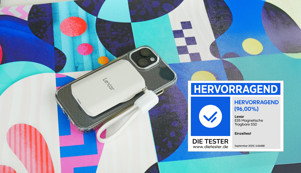 Die Lexar ES5 präsentiert sich im Test als kompakte und vielseitige Lösung für Speicherprobleme moderner Smartphones. Die kompakte Festplatte lässt sich dank MagSafe unkompliziert am iPhone befestigen und überträgt Fotos, Videos oder Dokumente per Plug&Play zuverlässig und schnell. Mit bis zu 2.000 Mb/s sind die Übertragungsraten sehr hoch, die Bedienung ist sehr einfach. Besonders praktisch: Über die Lexar-App können Fotos automatisch gesichert werden, sodass der begrenzte Smartphone-Speicher merkbar entlastet wird. Mit wahlweise 1 oder 2 TB Kapazität ist die ES5 auch für große Mediensammlungen gerüstet und zudem mit Windows-, Android- und Mac-Geräten kompatibel.