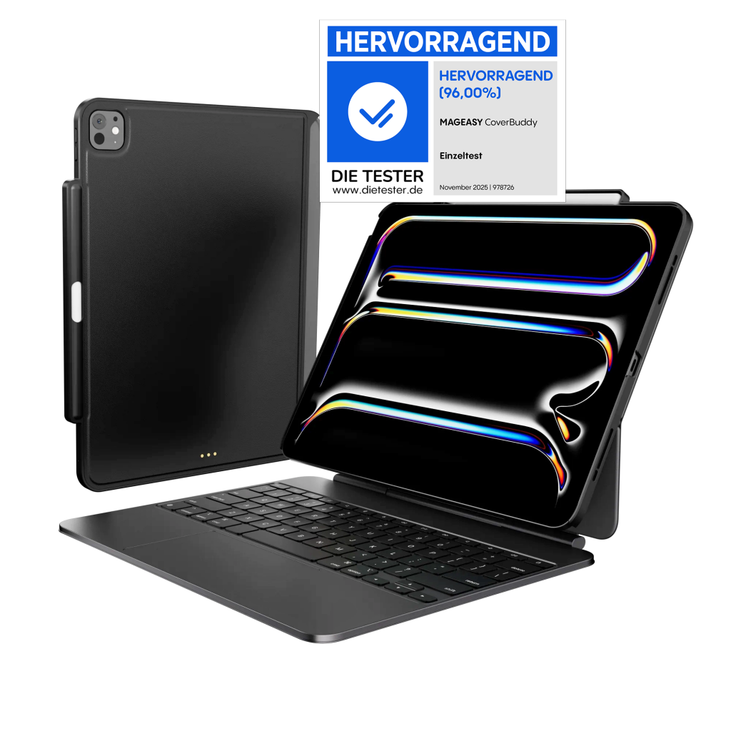 Der CoverBuddy von Mageasy richtet sich an iPad-Nutzer, die ihr Gerät mit dem Magic Keyboard verwenden und dennoch nicht auf Schutz verzichten möchten. Im Test überzeugt das Case mit passgenauem Sitz und der cleveren Smart-Connect-Technologie, die eine Verbindung zwischen iPad und Tastatur ermöglicht und dessen Nutzung in keiner Weise einschränkt. Das robuste Gehäuse schützt das Tablet zuverlässig. Zusätzlich ist das Case mit einer Halterung für den Apple Pencil ausgestattet. Hochwertiges Kunstleder sorgt zudem für eine edle, griffige Oberfläche.
