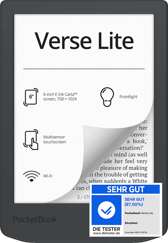 Der PocketBook Verse Lite richtet sich an alle, die unkompliziert und ohne Ablenkung lesen möchten. Der 6-Zoll-E-Ink-Carta-Bildschirm bietet mit 212 dpi eine gute Schärfe, und dank integrierter Beleuchtung lässt sich auch bei Dämmerung angenehm lesen. Mit rund 170 Gramm ist das Gerät sehr leicht und liegt selbst bei längeren Lesesessions bequem in der Hand. Die Bedienung erfolgt über einen Touchscreen.